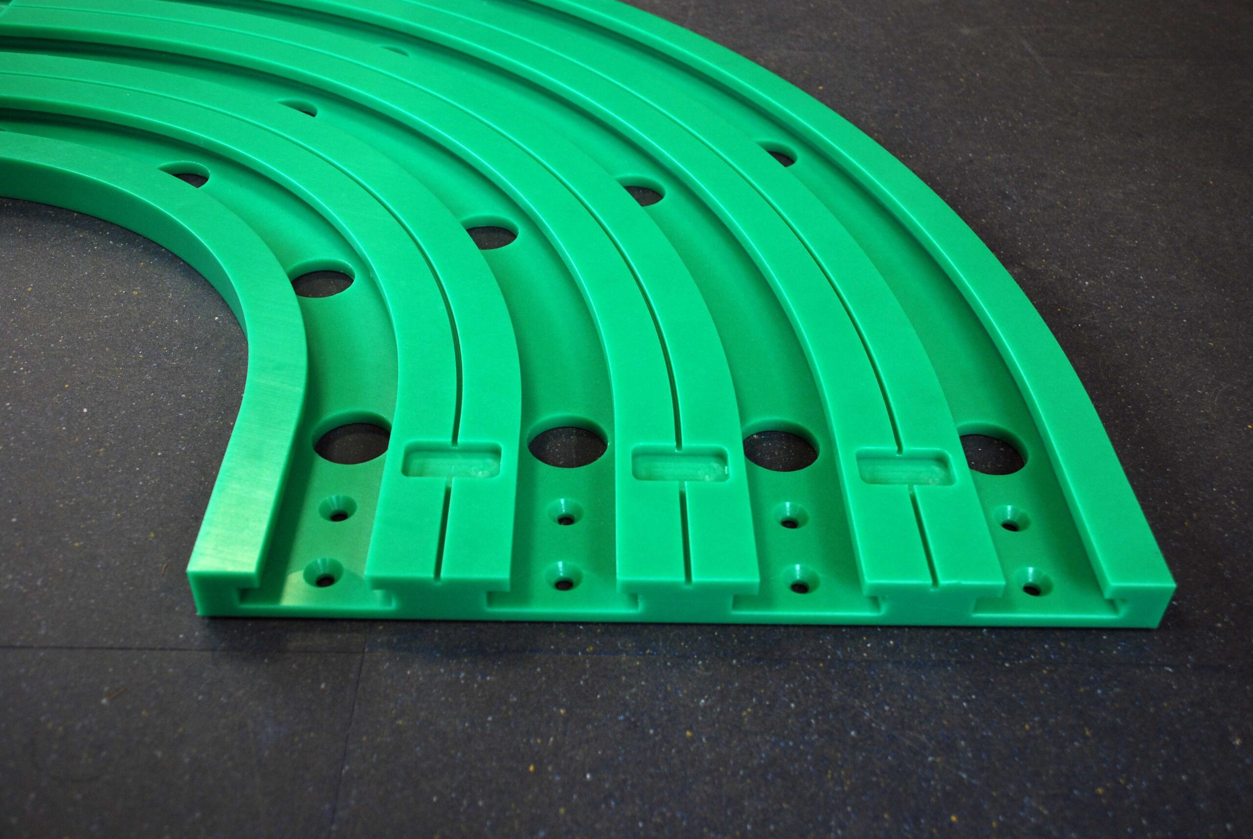 Le guide rettilinee e le curve per catene a tapparella e nastri modulari sono realizzate in Polizene 1000 nei colori standard nero e verde.